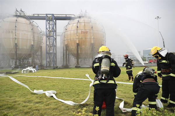 隨即,現(xiàn)場(chǎng)處置操作人員改動(dòng)工藝流程停止2003罐接收液化氣,對(duì)泄漏點(diǎn)進(jìn)行蒸汽稀釋,投用消防噴淋實(shí)施降溫掩護(hù);啟動(dòng)注水泵,通過(guò)泄漏管線向罐內(nèi)注水,待泄漏點(diǎn)有水流出后,檢修人員使用卡具對(duì)法蘭實(shí)施帶壓堵漏,消除漏點(diǎn)。消防人員啟用消防炮和消防車,用消防水稀釋、降溫。環(huán)保檢測(cè)人員組織做好周邊區(qū)域水體防控和大氣檢測(cè)。經(jīng)過(guò)現(xiàn)場(chǎng)緊張有序高效的處置,此次液化石油氣泄漏突發(fā)事件應(yīng)急救援演練圓滿結(jié)束。