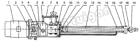 | 1、機座 2、聯軸器 3、泵機座 4、泵 5、油箱 6、集成塊 7、檢修口 8、空氣濾器 9、油缸底座 10、節流閥 11、鎖緊圓螺母 12、活寒 13 活寒環 14、油缸體 15、導向套 16、缸頭螺母 17、防塵套 18、拼緊螺母 19、連接叉頭 |
